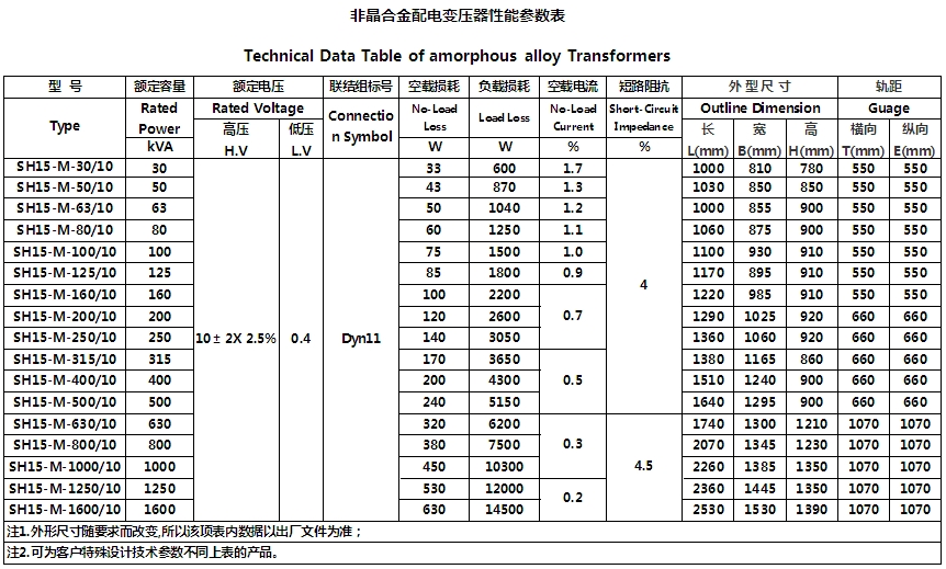華盈公司SH15系列(10kV級) 三相油浸式非晶合金變壓器技術參數(shù):